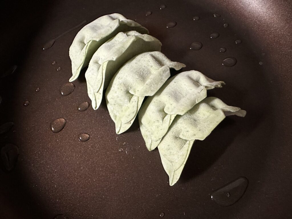 少量の油をひいて、凍ったままの餃子をフライパンに並べます(この時火を止めておいた方が並べやすいです)。