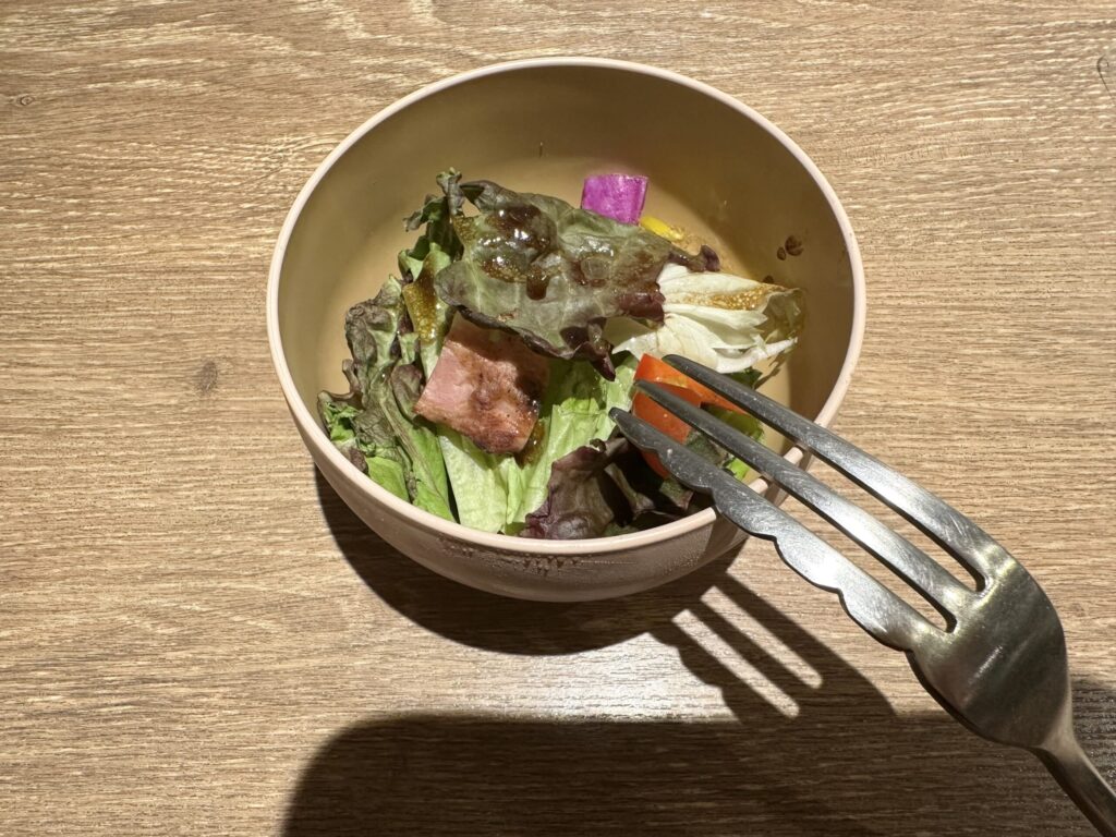 ランチセットはサイドメニューが選べて、私はサラダとトーストを選択(トーストは撮ってません)。サラダのドレッシングもバターしみしみのトーストも美味しくて、サイドまで満足度かなり高めです。ただし、サイドメニューの売り切れがかなり早いです。私が注文した直後にはサラダと「ちょい飯」と言われるちょっとしたご飯もののサイドが売り切れていたので、ランチセット狙いなら早めの時間帯がおすすめです。