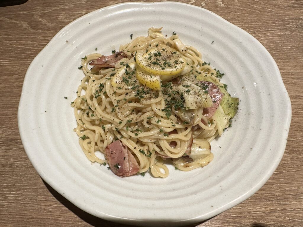 一番のポイントはパスタのもちもち感。生パスタならではの食感で、茹でたてのやわらかさとしっかりしたコシが両立しています。注文したのは「ジョンレモン」というレモンクリームパスタで、名前のユーモアにも思わず笑いましたが、味は本気。さっぱりしたレモンの風味とクリームのコクのバランスが絶妙でした。