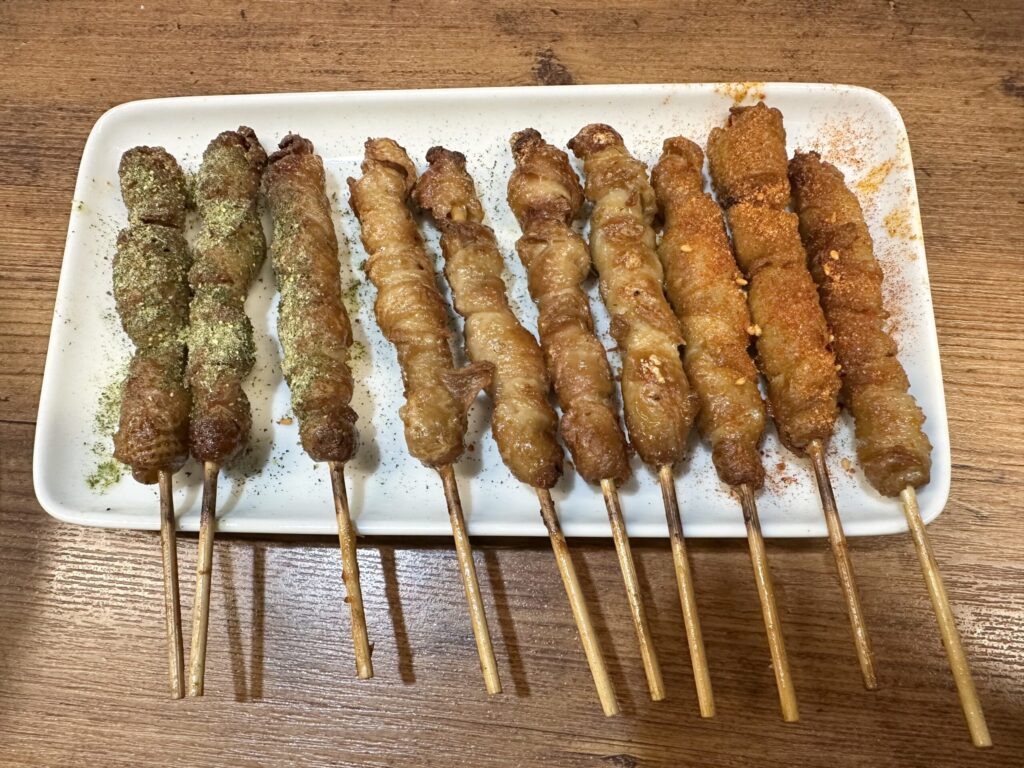 竹乃屋で頼んでほしいのが「ぐるぐる」と呼ばれる鶏皮の串。鶏皮をくるくると巻いて串に刺したもので、しっかり焼き上げているので油っぽさが全くなく、皮のうまみだけが凝縮されています。