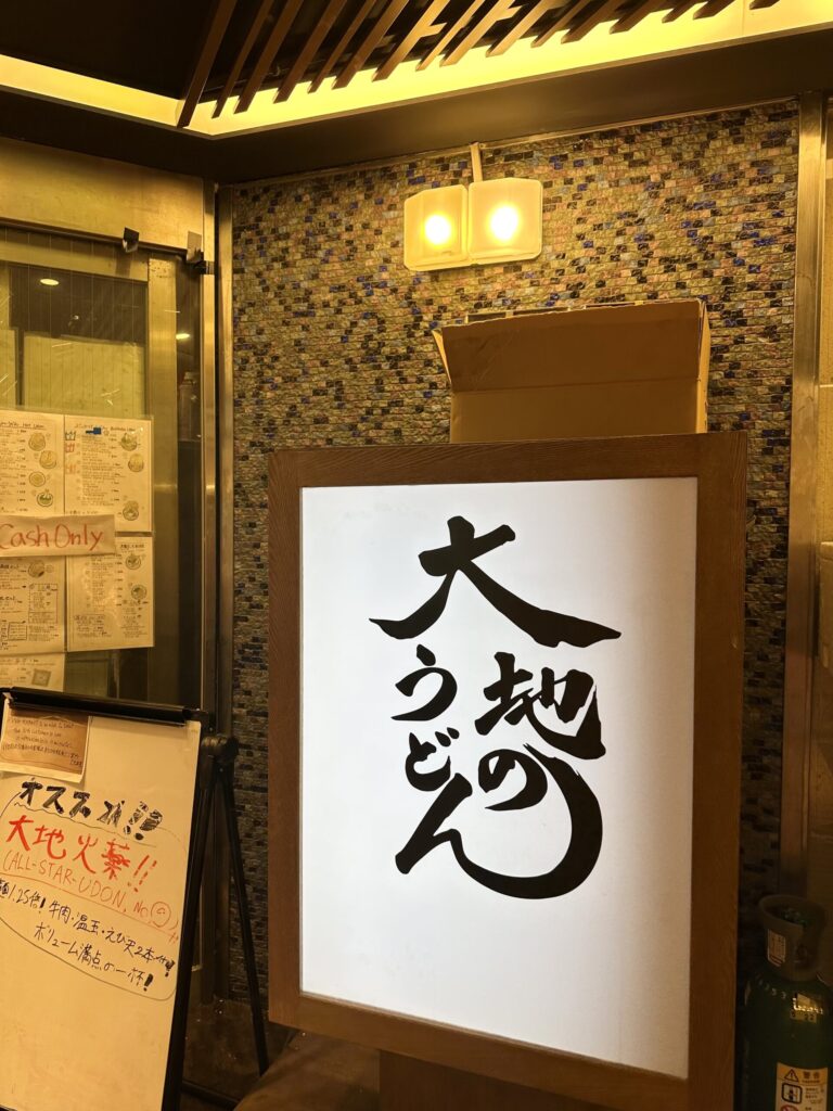 2日目の夜は「出汁が美味しい」とおすすめされていた「大地のうどん」へ。ぼんじょるのと同じ地下街の並びにあって、2店舗ほど奥に入ったところにあります。