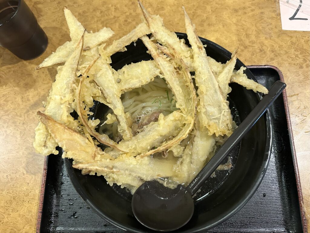 注文したのは牛ごぼ天うどん。まずごぼう天の形状が独特で、見た目からして「これは食べたことがないやつだ」とわかります。うどんは博多らしいやわらかめの仕上がりなのに、ほんのりプリプリ感もあって、出汁のうまみをしっかり吸い込んでいます。