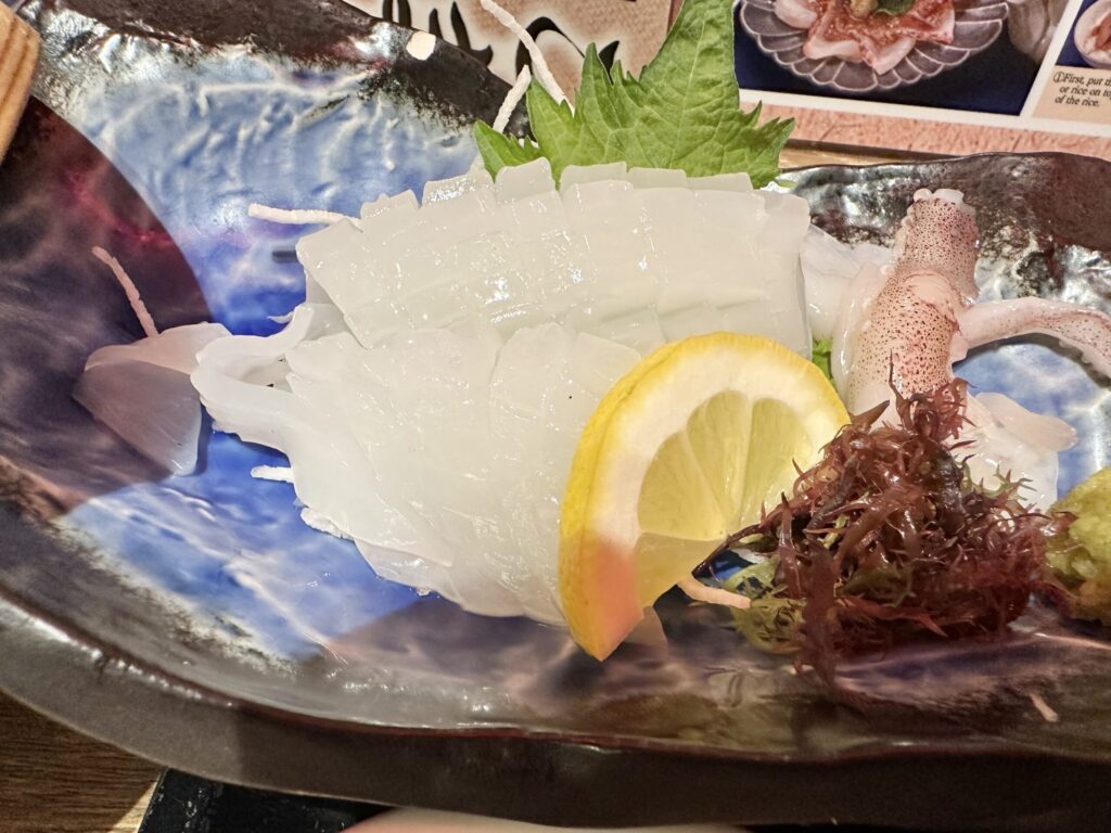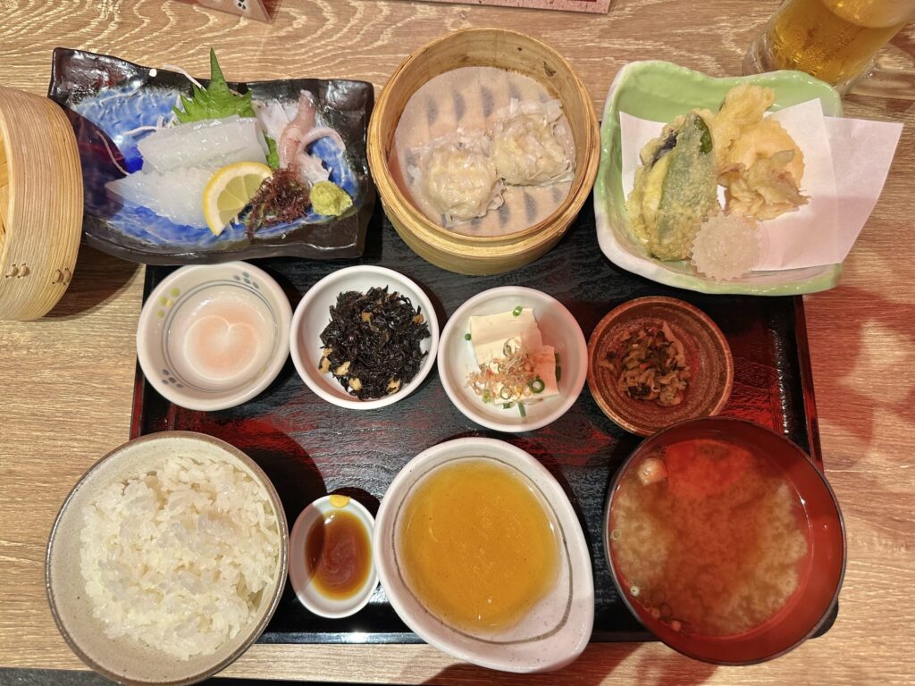 運ばれてきたイカのお刺身が、ほんのり透けていてびっくりしました。地下街の食堂でこのクオリティは正直予想外で、さすが博多だと実感した一皿です。イカのシュウマイも天ぷらも、どれも丁寧な味わいで、出張最後の夜にふさわしい締めくくりになりました。
