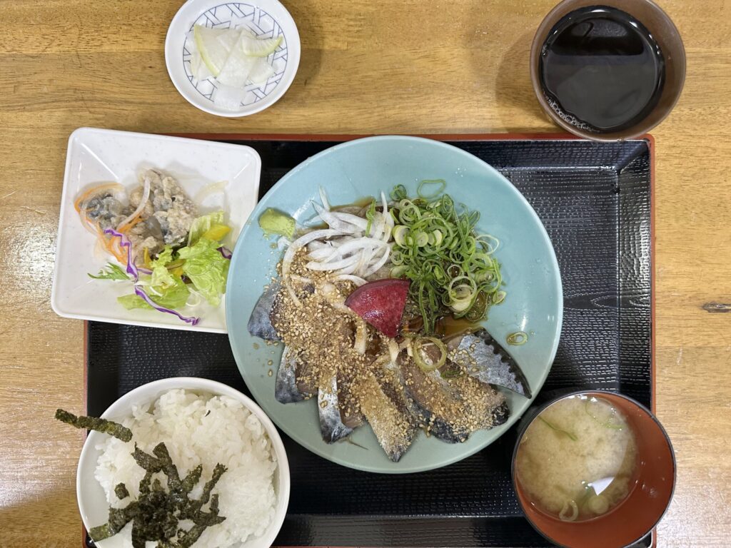 「とろさば丼」を注文したのですが、運ばれてきて思わず二度見しました。丼と書いてあるのに、皿に乗っているんです。南蛮漬けやサラダはセルフサービスで自由に取れるので、自分のペースで食事を組み立てられるのも気軽でいいです。