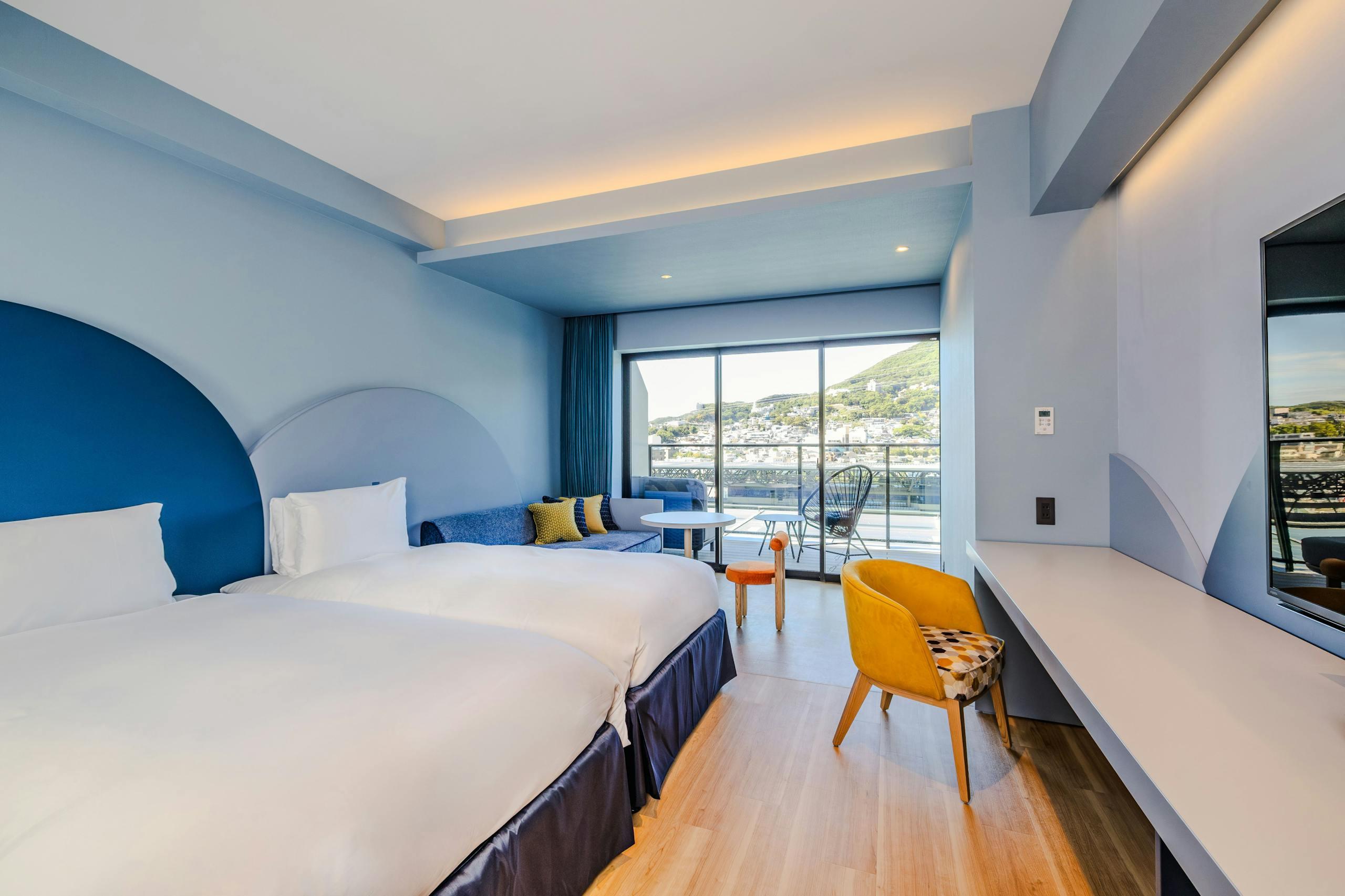 客室の中には「試合開催時はボックスシートとしてベッドを壁に収納、宿泊利用時は客室になる可変タイプの部屋」なるお部屋もあるとのこと。